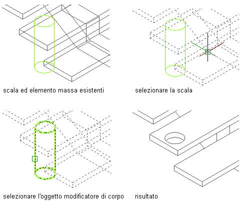 Il modificatore di corpo tridimensionale (3D) può essere creato da un elemento massa, da un gruppo di masse o da qualsiasi altro oggetto AEC con massa. I modificatori di corpo possono anche essere creati da solidi ACIS o da blocchi che costituiscono dei corpi 3D. L'oggetto deve essere posizionato nel disegno prima di poter essere impostato come modificatore di corpo.