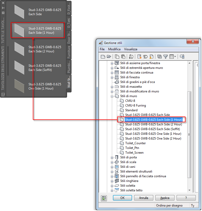 . Ad esempio, se si desidera creare uno strumento Muro con lo stile Stud-3.625 GWB-0.625 Each Side (1 Hour), espandere Stili di muro, quindi selezionare lo stile Stud-3.625 GWB-0.625 Each Side (1 Hour).