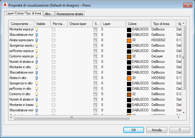 Per impostare la modalità di visualizzazione dei componenti di scala in vista piana a seconda della relativa posizione al di sopra o al di sotto del prospetto del piano di taglio, attenersi alla procedura indicata di seguito. È possibile impostare proprietà per gli elementi al di sopra del piano di taglio, gli elementi superiori e gli elementi inferiori di ciascun tipo di componente di scala.