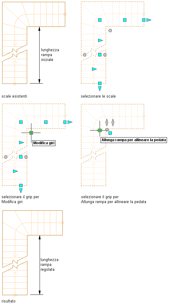 Allungamento di una rampa per allineare il bordo di una pedata al centro del giro
