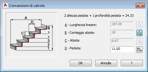 In base alla combinazione dei campi selezionati, alcune quote che interagiscono possono essere definite dall'utente, altre sono automatiche. Se è attivo il calcolatore basato sulle convenzioni, sono disponibili soltanto combinazioni logiche. Se tale calcolatore non è attivo, l'utente può definire la lunghezza lineare o delle pedate e il conteggio o l'altezza delle alzate.