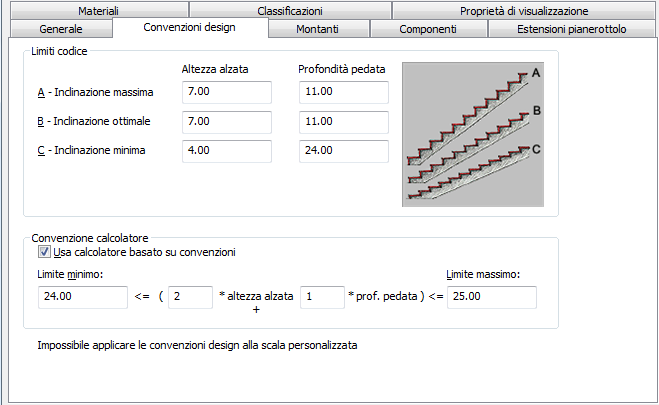Per impostare il limite codice minimo, massimo e ottimale per l'altezza delle alzate e la profondità delle pedate oltre che per specificare le convenzioni di calcolo della scala, attenersi alla procedura indicata di seguito.