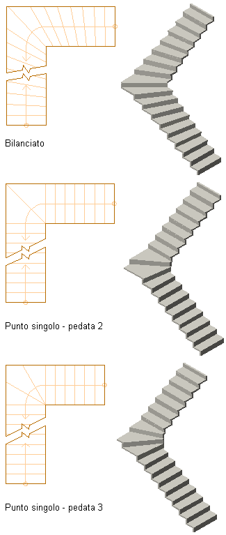 Sono disponibili tre diversi tipi di gradini a piè d'oca che consentono diversi livelli di impostazione per le scale con 1/2 e 1/4 di giro: Bilanciato, Punto singolo e Manuale.