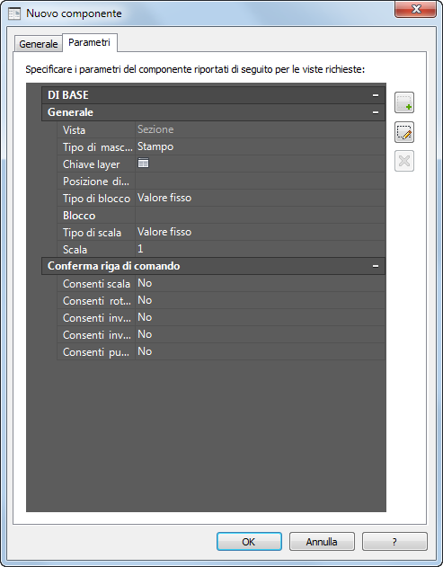 7. Nella scheda Parametri, se lo si desidera, impostare un tipo di maschera di inserimento diversa da quella di default, Stampo, per la vista di sezione di default, quindi specificare i valori di parametro desiderati per il componente attenendosi alle istruzioni riportante nella tabella che segue la figura sottostante. È anche possibile rinominare la vista di default facendo clic su , oppure creare altre viste facendo clic su . Qualsiasi vista creata o rinominata sarà quindi disponibile dall'elenco a discesa.