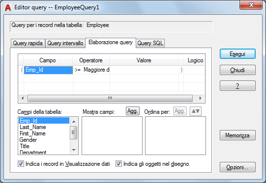 Consente di selezionare uno o più campi da includere nella query. Fare doppio clic sulla cella Campo della riga corrente per visualizzare l'elenco dei campi disponibili della tabella di database corrente che è possibile utilizzare per creare la query. Per aggiungere un altro parametro, specificare un operatore e un valore per la riga corrente, quindi selezionare la cella Logico.