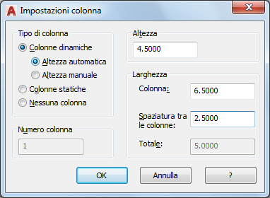 Visualizza e consente di controllare i valori di larghezza delle colonne e della spaziatura tra le colonne. Il valore di spaziatura tra le colonne corrisponde a cinque volte l'altezza di default del testo.