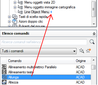 6. Nel riquadro Elenco comandi, trascinare il comando da aggiungere al menu di scelta rapida della barra degli strumenti nel riquadro Personalizzazioni in <nome file>.