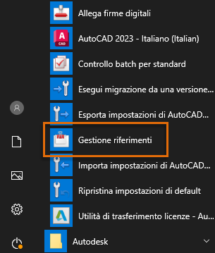 È possibile avviare Gestione riferimenti dal menu Start di Windows facendo clic su Autodesk > AutoCAD release > Gestione riferimenti.