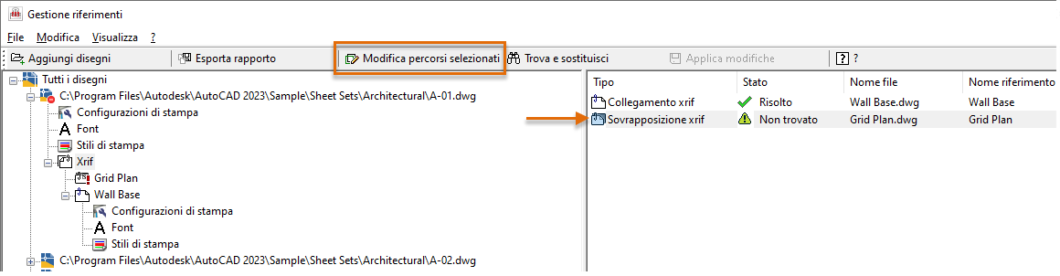 Nota: L'aggiornamento dei percorsi dei riferimenti con Gestione riferimenti potrebbe comportare il salvataggio dei file di disegno in un formato diverso rispetto all'ultimo salvataggio.