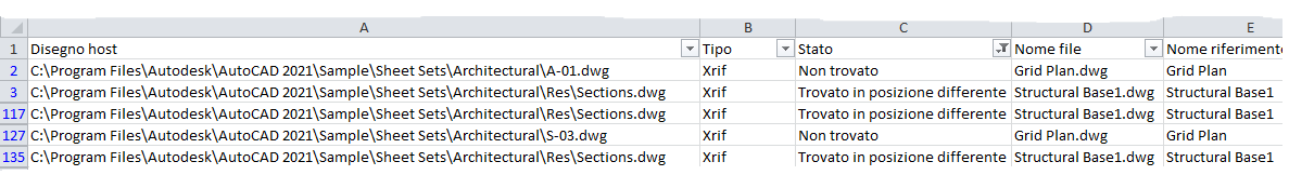 Suggerimento: Quando si apre un file CSV o XLS in Microsoft Excel, è possibile utilizzare gli strumenti di filtro dei dati dell'applicazione per ordinare/filtrare rapidamente il rapporto per individuare i file di riferimento mancanti e copiare tali informazioni in un messaggio e-mail per consentire al cliente o al subappaltatore di sapere quali file sono mancanti.