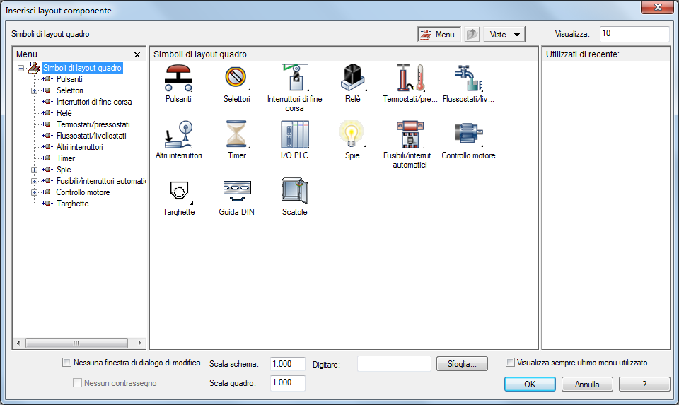 Per i componenti del quadro che non compaiono nello schema, utilizzare il menu icone quadro per inserire i layout del quadro. Trova