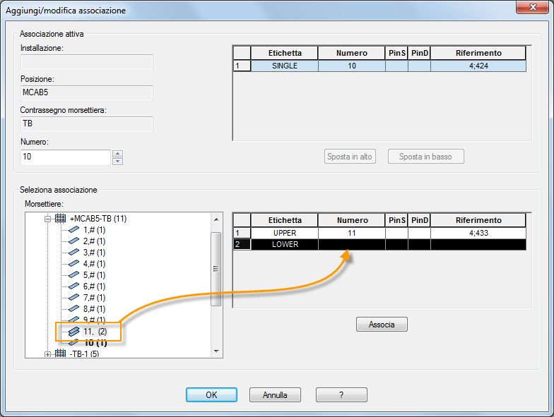 Se i morsetti non sono nello stesso disegno, modificare il morsetto da inserire in un'associazione con un altro morsetto. Selezionare il pulsante Aggiungi/Modifica per aprire la finestra di dialogo Aggiungi/modifica associazione. In questa finestra è possibile inserire il morsetto in un livello aperto su un altro morsetto.