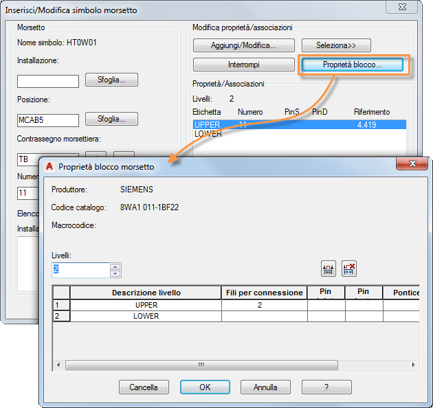 Il simbolo di un morsetto dello schema può rappresentare un morsetto a livello singolo o un livello di un morsetto multilivello. Il numero di livelli del morsetto viene definito come proprietà di blocco. Ogni livello presenta determinate caratteristiche, quali un'etichetta, dei fili per connessione, il pin sinistro e il pin destro. Ogni simbolo di morsetto dello schema presenta tutte le proprietà di blocco dei singoli livelli. Pertanto, la rimozione di un simbolo di morsetto non determina quella delle proprietà di blocco. La modifica di una proprietà di blocco determina l'aggiornamento di tutti i simboli dei morsetti. Un simbolo senza proprietà di livello viene considerato come un morsetto a livello singolo. Le proprietà dei morsetti possono far parte di un'assegnazione di catalogo e possono essere applicate automaticamente quando si assegna il catalogo.