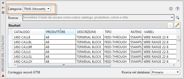 È possibile inserire i morsetti come gli altri simboli dello schema dal browser del catalogo o dal menu icone. Quando si inseriscono i morsetti dal browser del catalogo, selezionare la categoria TRMS (Morsetti).