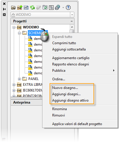 Consente di aggiungere disegni esistenti ad un progetto attivo in qualsiasi momento. Ciò è utile quando si desidera riutilizzare i disegni di un progetto precedente. Per aggiungere o creare i disegni in una cartella specifica, fare clic con il pulsante destro del mouse sul nome della cartella in Gestione progetti e selezionare l'opzione del disegno.