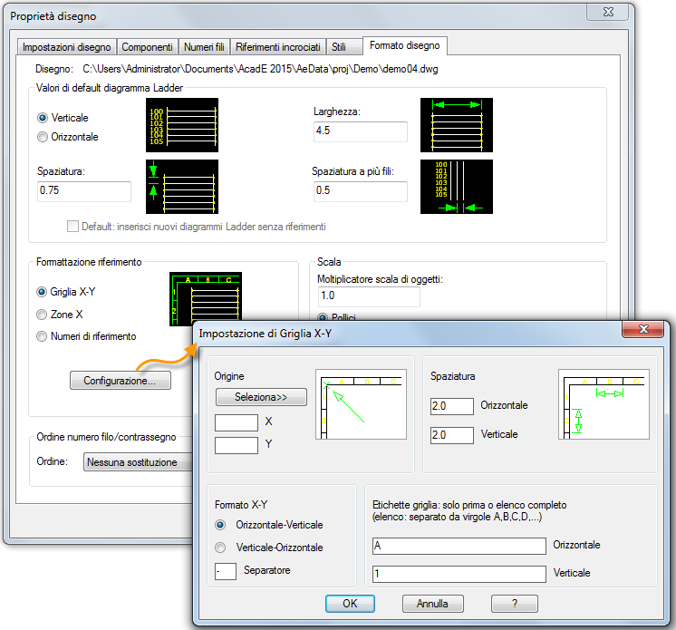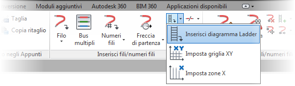 Dopo avere definito il formato del sistema di riferimento, è possibile inserire il diagramma Ladder, la griglia X-Y o le zone X in un disegno. Individuare i comandi nella scheda Schema