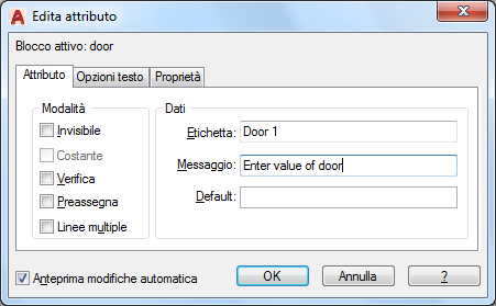 Attiva e disattiva l'assegnazione dei valori di default. Se l'opzione viene selezionata, imposta l'attributo sul valore di default al momento dell'inserimento del blocco. Se l'opzione viene deselezionata, il valore di default dell'attributo viene ignorato e viene richiesto di digitare un valore al momento dell'inserimento del blocco.