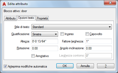 Verifica che l'area del disegno sia aggiornata immediatamente per visualizzare tutte le modifiche apportate agli attributi visibili. Se l'opzione Anteprima modifiche automatica viene selezionata, le modifiche saranno immediatamente visibili. Se l'opzione Anteprima modifiche automatica viene deselezionata, le modifiche non saranno immediatamente visibili.