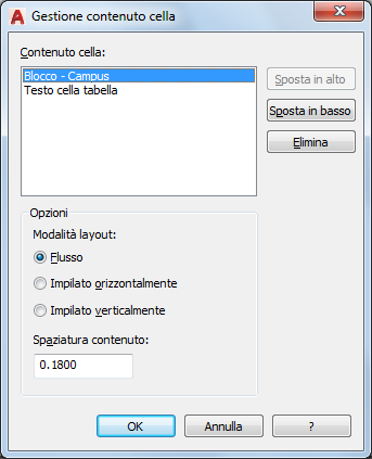 Elenca nell'ordine di visualizzazione il testo e/o i blocchi presenti nella cella selezionata. Il testo è indicato con l'etichetta Testo cella tabella. I blocchi vengono indicati con il termine Blocco che ne precede il nome.
