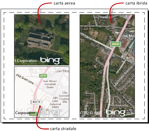 È possibile visualizzare la Carta come immagine satellitare (stile vista aerea) o come immagine vettoriale (stile vista stradale). È inoltre possibile visualizzare la Carta con uno stile ibrido, risultante dalla combinazione della vista aerea e di quella stradale. Se l'area di disegno è suddivisa in più finestre, in ciascuna finestra può essere impostato un diverso stile di Carta.