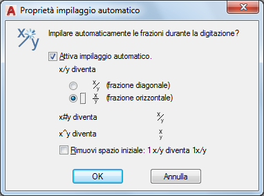 Converte la barra (/) in una frazione diagonale quando è attivato l'impilaggio automatico.