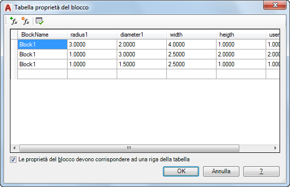 Nella finestra di dialogo Tabella proprietà del blocco, le intestazioni di colonna corrispondono ai parametri, mentre le righe definiscono i valori del gruppo di proprietà. È possibile impostare un riferimento di blocco selezionato sui valori definiti sopra. Ciascuna definizione di blocco può disporre di una tabella.