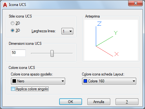 Specifica la visualizzazione dell'icona UCS 2D o 3D e il relativo aspetto.
