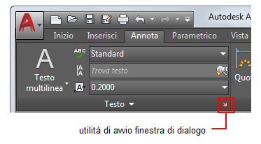 Alcuni gruppi della barra multifunzione consentono di accedere ad una finestra di dialogo correlata. Per visualizzare la finestra di dialogo, fare clic sull'utilità di avvio finestra di dialogo indicata da un'icona a forma di freccia, , nell'angolo inferiore destro del gruppo.