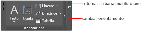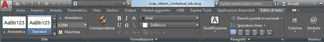 Quando si seleziona un particolare tipo di oggetto o si avviano determinati comandi, viene visualizzata una scheda contestuale della barra multifunzione anziché una barra degli strumenti o una finestra di dialogo. La scheda contestuale viene chiusa al termine del comando.