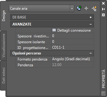 Nota: Nella tabella seguente, le proprietà relative alla Connessione a flangia sono precedute da un asterisco (*). Le proprietà relative alla Deviazione sono precedute da due asterischi (**). Le proprietà relative ai un canali aria flessibili sono precedute da tre asterischi (***) e sono disponibili solo quando è selezionato il rispettivo oggetto.