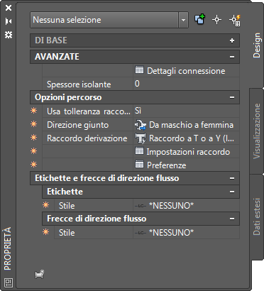 Proprietà disponibili nella scheda Design del riquadro proprietà per l'aggiunta di oggetti tubo.