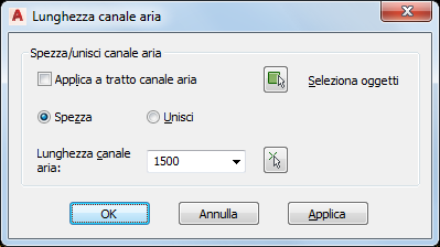 Interrompere un segmento Selezionare Spezza, quindi immettere un valore per Lunghezza canale aria. È inoltre possibile fare clic su (Selezionare la lunghezza canale aria), quindi specificare un punto iniziale e un punto finale per la nuova lunghezza.