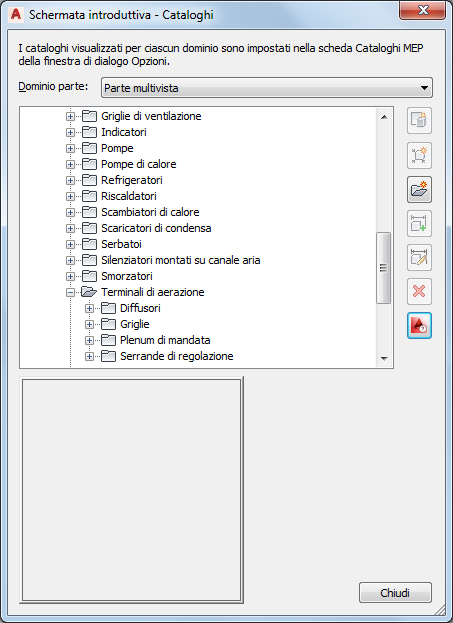 Quando si avvia il Generatore di contenuti, viene visualizzata la finestra di dialogo Schermata introduttiva - Cataloghi. Si tratta di una finestra di dialogo specifica per attività che funziona come un interruttore, offrendo rapido accesso ad ambienti di lavoro diversi. Nella finestra di dialogo Schermata introduttiva - Cataloghi sono disponibili un browser delle parti e una barra delle icone. Nella scheda Cataloghi MEP della finestra di dialogo Opzioni, è possibile selezionare un catalogo dall'elenco dei cataloghi parti caricati. Per ulteriori informazioni sui cataloghi parti e sulle modalità di archiviazione delle parti in un catalogo, vedere Concetti di base sui cataloghi parti.