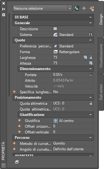 Il riquadro proprietà mostra un valore accanto al campo Velocità, ad indicare che la dimensione del canale aria è stata calcolata utilizzando il metodo di velocità costante.