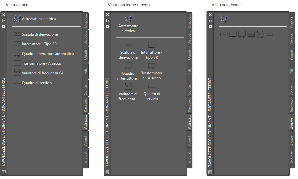 La stessa tavolozza degli strumenti visualizzata in tre modi diversi