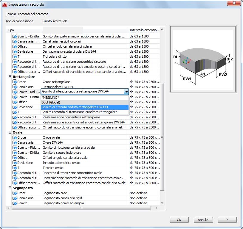 Quando si configura una preferenza di percorso per una determinata specifica, i raccordi appropriati vengono inseriti automaticamente nel layout del canale aria.