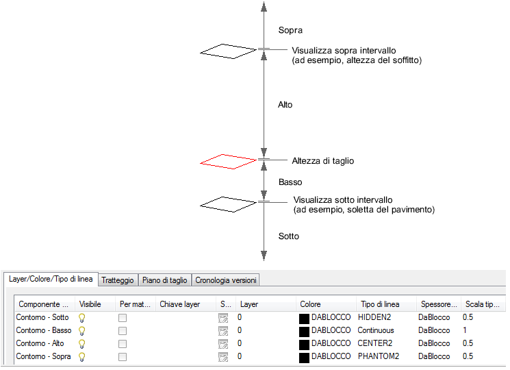 I valori immessi per gli intervalli Sopra e Sotto non sono relativi all'altezza di taglio. Sono valori di altezza assoluti calcolati dall'origine WCS. Pertanto, il valore che si immette per Visualizza sopra intervallo deve essere superiore al valore immesso per Altezza di taglio. Valori non validi causeranno risultati non corretti.