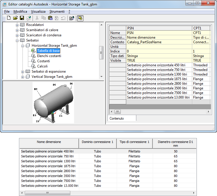 I parametri comuni restano costanti per tutte le dimensioni parte; vengono definiti una volta in una famiglia di parti e condivisi da tutte le dimensioni parte. Se si modifica un parametro comune, questo viene aggiornato per tutte le dimensioni parte. Domini, tipi e sottotipi fanno parte dei parametri comuni. Di seguito sono illustrati esempi di parametri comuni per dimensioni parte meccaniche, elettriche e idrauliche.