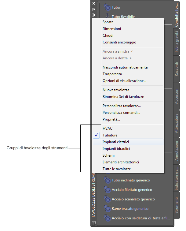 Nel menu di scelta rapida selezionare il gruppo di tavolozze degli strumenti da visualizzare.