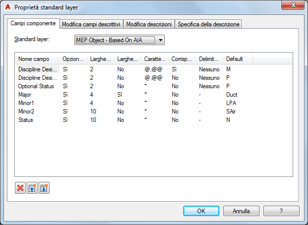 Il software include diversi standard layer di default basati sulle convenzioni del settore relative ai layer, ad esempio oggetti MEP basati su standard AIA, su linee guida BS1192 e su standard AUG versione 2. Quando si crea un layer basato su uno standard layer, il nome del layer è composto da diversi elementi separati da delimitatori, ad esempio trattini. Ogni elemento del nome viene determinato dalle convenzioni specificate nella definizione dello standard layer. In AutoCAD MEP le definizioni degli standard layer di default si basano su standard layer comuni del settore. Ad esempio, in base allo standard layer Oggetto MEP, il nome del layer per il canale aria è M-CanAria-Stand.