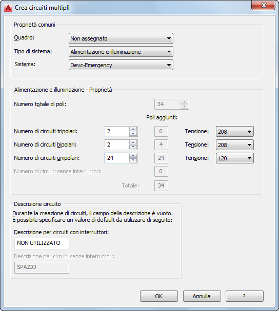 - Quadro: se è stato selezionato il nome di un quadro prima di avviare il comando, questo campo è disattivato. Se è stato selezionato <Non assegnato>, selezionare un quadro dall'elenco a discesa. Selezionare <Non assegnato> in questo elenco se non si desidera ancora assegnare il circuito ad un quadro.