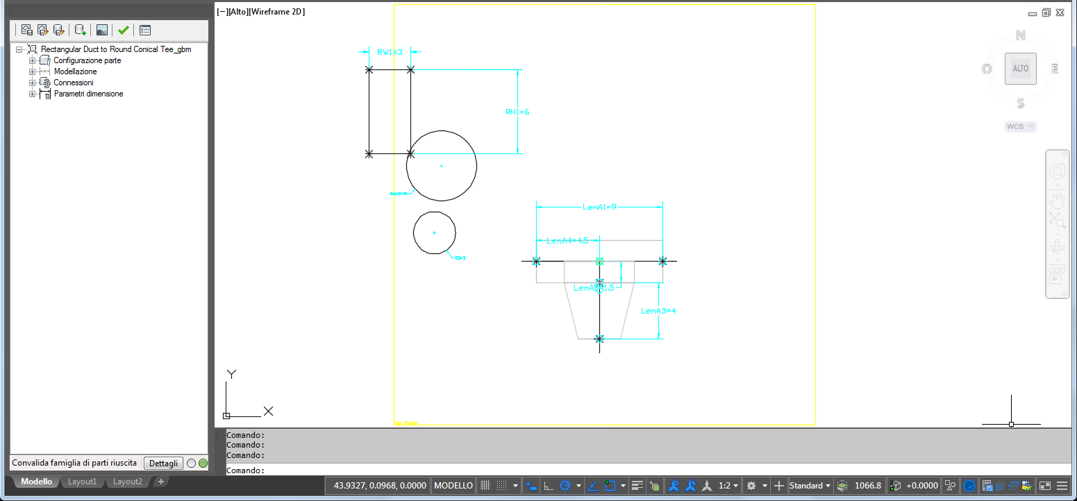 Quando si sceglie di creare o modificare una parte parametrica, nel Generatore di contenuti viene utilizzato l'ambiente di costruzione parametrico. Nel seguente esempio il Generatore di contenuti visualizza un T ad innesto conico per canale aria da rettangolare a circolare. Per ulteriori informazioni, vedere Avvio del Generatore di contenuti.