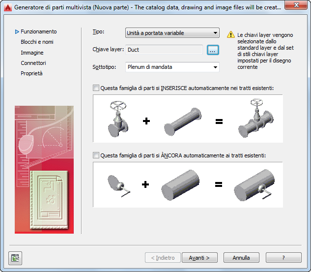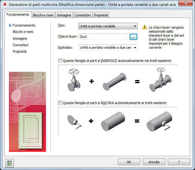 La finestra di dialogo Generatore di contenuti offre varie opzioni specifiche per la creazione di parti personalizzate in AutoCAD MEP. È possibile creare o modificare sia le parti parametriche che le parti basate su blocchi.