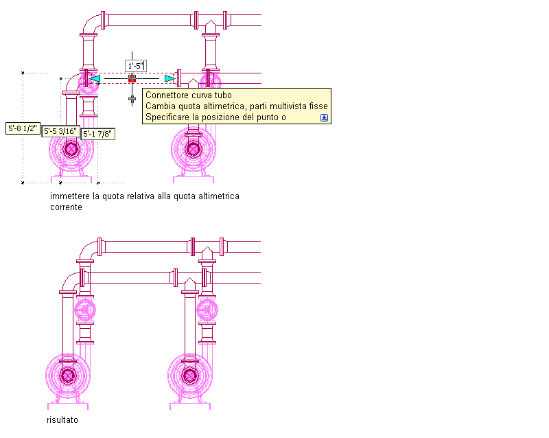 L'immagine seguente illustra la modifica della quota altimetrica di un segmento di tubo. Per aumentare lo spazio di accesso alla manopola della valvola, un segmento di tubo orizzontale viene alzato in base a una quota relativa alla sua quota altimetrica. Pertanto, gli oggetti connessi vengono regolati automaticamente per mantenere la connettività.