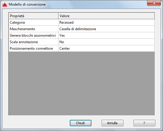 Nota: Questo modello di conversione rappresenta il meccanismo tramite cui vengono specificati i valori di default per le impostazioni dello script di conversione creato. Dopo aver creato lo script, è possibile personalizzare le impostazioni in base alle esigenze.