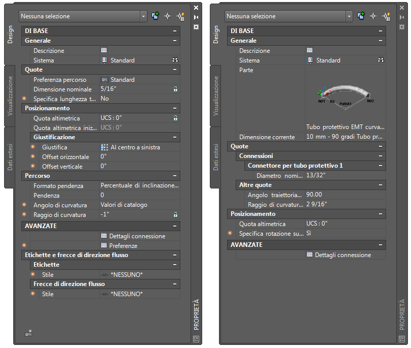 .Per specificare le impostazioni di tubi protettivi e raccordi, è possibile utilizzare il riquadro proprietà per i tubi protettivi.