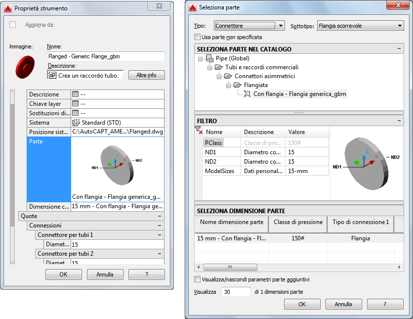 Suggerimento: Selezionare Usa parte non specificata per disattivare le selezioni di parti eseguite in questa finestra di dialogo. Con tale selezione, nella tavolozza degli strumenti viene creato uno strumento a cui non sono associate le proprietà specificate. È possibile utilizzare il nuovo strumento al fine di avviare il comando Aggiungi raccordo per l'oggetto durante il layout del tratto di tubo.