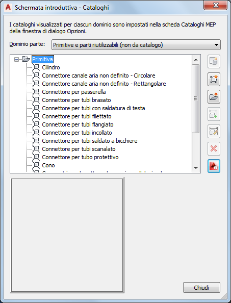 2. Nella finestra di dialogo Schermata introduttiva - Cataloghi, in Dominio parte selezionare Primitive e parti riutilizzabili.