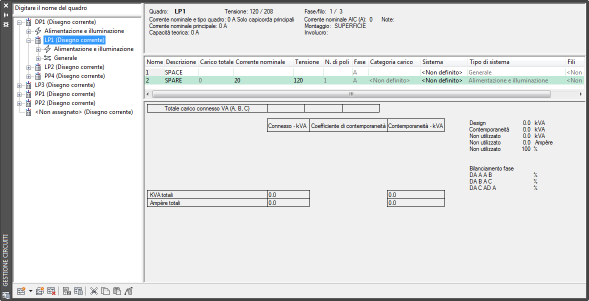 In Gestione circuiti vengono visualizzati i circuiti definiti nel disegno e nel database di progetto, suddivisi in base al tipo di quadro e sistema, come illustrato di seguito.