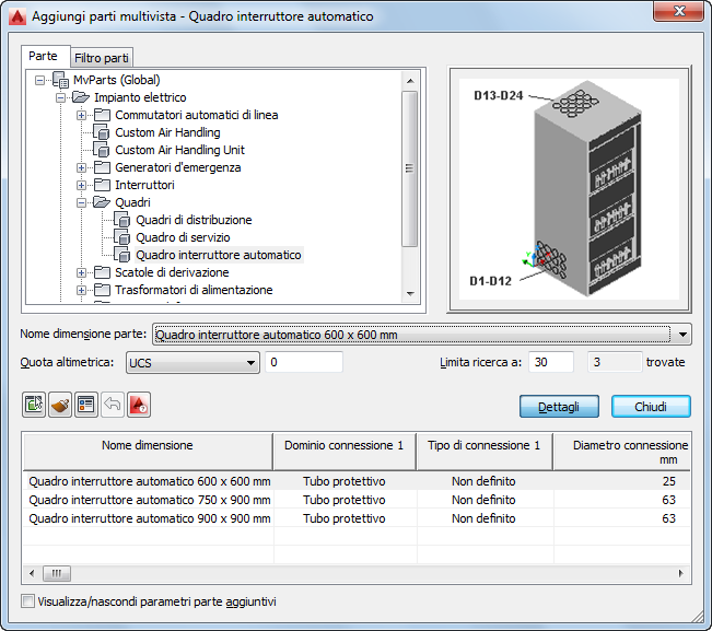 - Fare clic su Dettagli per visualizzare le dimensioni disponibili per il sottotipo parte selezionato.